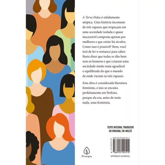 A Terra Delas é nitidamente utópica. Uma história incomum de três rapazes que tropeçam em uma sociedade isolada e quase inacessível composta apenas por mulheres e que existe há séculos. Como isso é possível? Bem, você terá de ler o romance para saber. Basta dizer que todas se dão bem sem os homens e que criaram uma sociedade muito mais agradável e equilibrada do que o mundo de onde vieram os três rapazes. Esta obra é considerada literatura feminista, e isso se encaixa perfeitamente em Perkins, porque ela era, antes de mais nada, uma feminista.