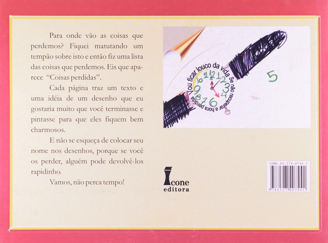 Para onde vão as coisas que perdemos? A autora ficou matutando um tempão sobre isto e então fez uma lista de coisas que perdemos. Eis que apareceu “Coisas Perdidas”. Cada página traz um texto e uma idéia de um desenho para o leitor desenhar e pintar para que fiquem bem charmosos. E não se esqueça de colocar seu nome nos desenhos, porque se você perdê-los, alguém pode devolvê-los rapidinho.