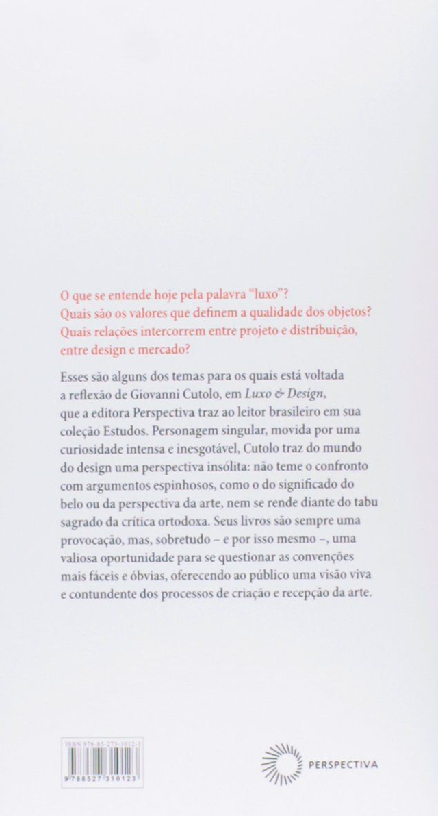 O que se entende hoje pela palavra ´luxo´?Quais são os valores que definem a qualidade dos objetos?Quais relações intercorrem entre o projeto e distribuição, entre design e mercado?Esses são alguns dos temas para os quais está voltada a reflexão de Giovanni Cutolo, em ´Luxo & Design´, que a editora perspectiva traz ao leitor brasileiro em sua coleção Estudos. Personagem singular, movida por uma curiosidade intensa e inesgotável, Cutolo traz do mundo do design uma perspectiva insólita: não teme o confronto com argumentos espinhosos, como o do significado do belo ou da perspectiva da arte, nem se rende diante do tabu sagrado da crítica ortodoxa. Seus livros são sempre uma provocação, mas, sobretudo - e por isso mesmo -, uma valiosa oportunidade para se questionar as convenções mais fáceis e óbvias, of...